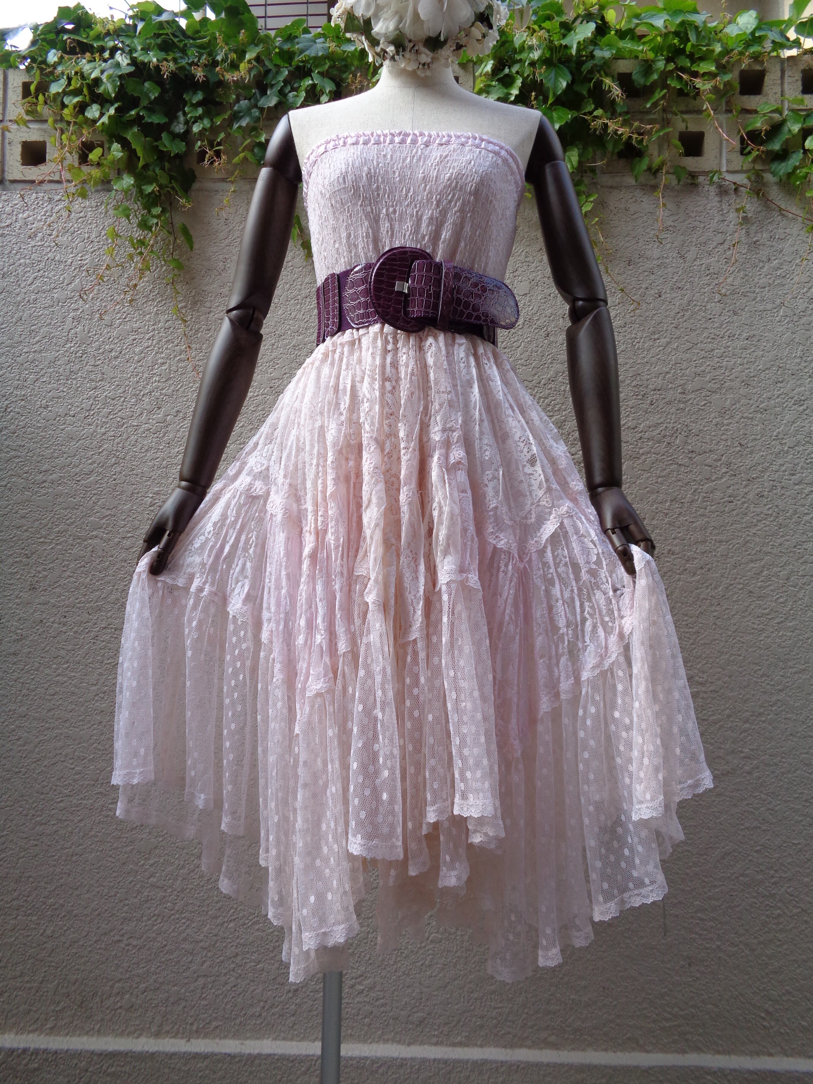 アシンメトリーな裾のレーススカートです。ウエスト部分が幅広のシャーリングになっているのでベアトップワンピースとしても着ていただけます。