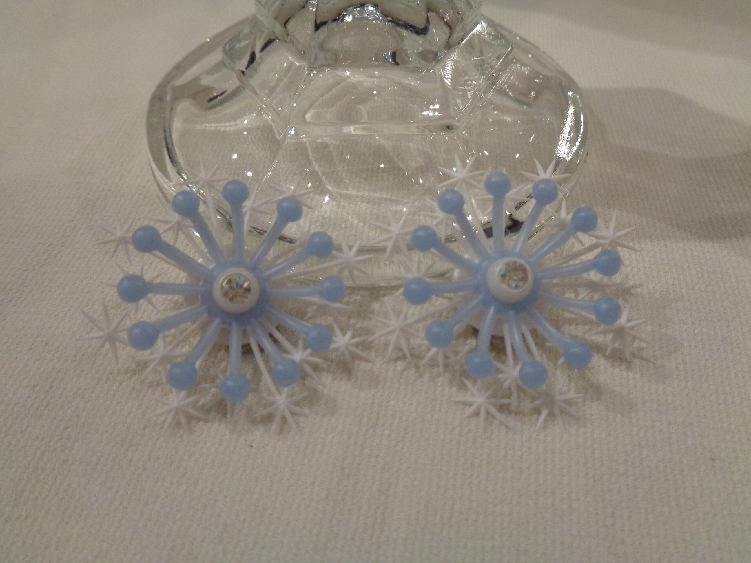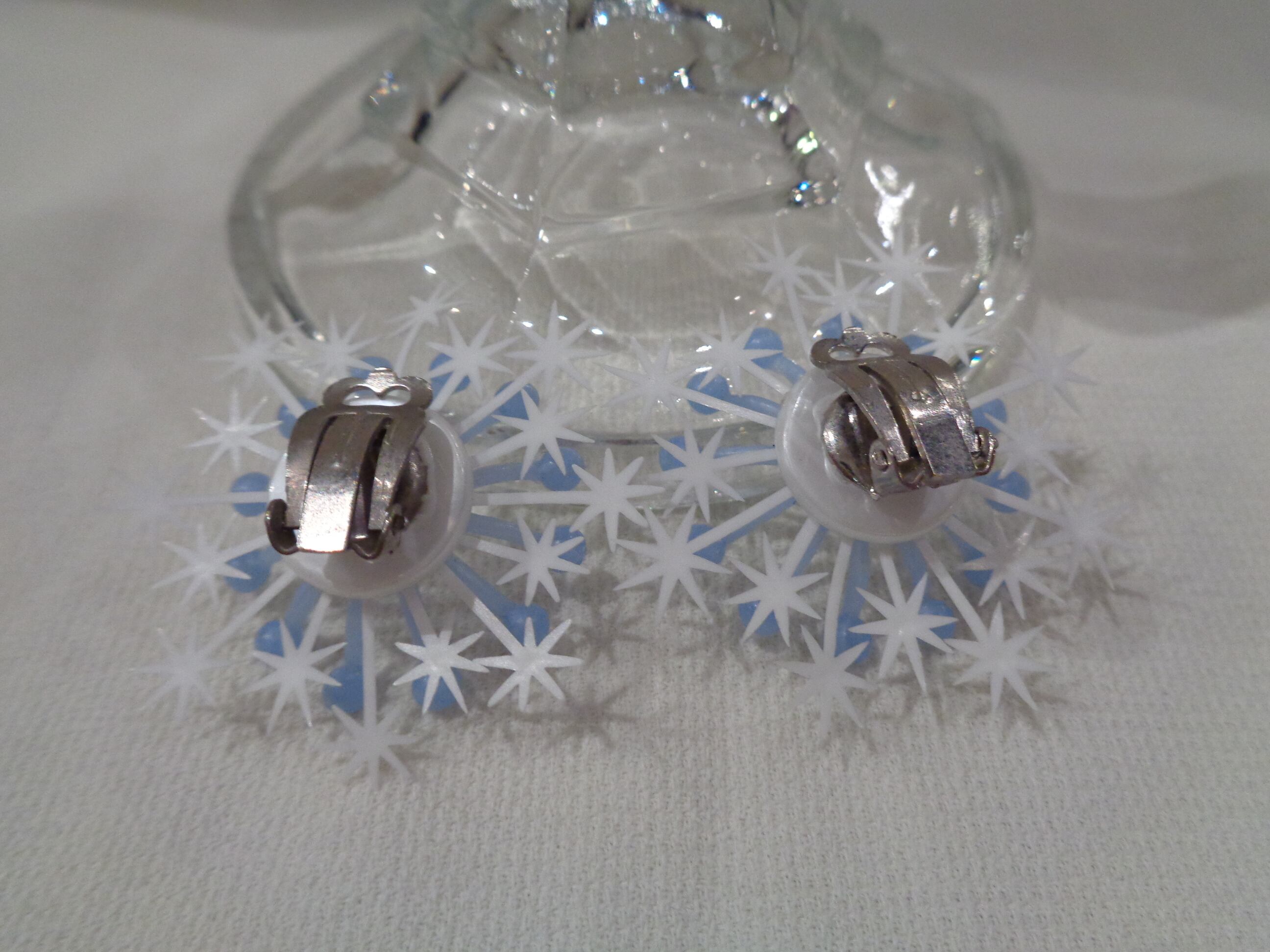柔らかいプラスチックのお花のイヤリングです。ペールブルーとホワイトの涼しげな色合いとビジューの組み合わせが可愛らしいです。