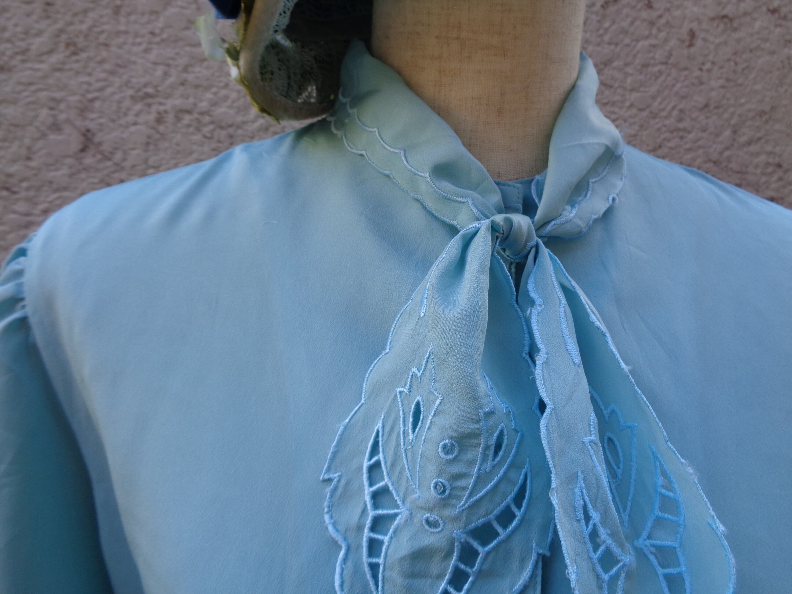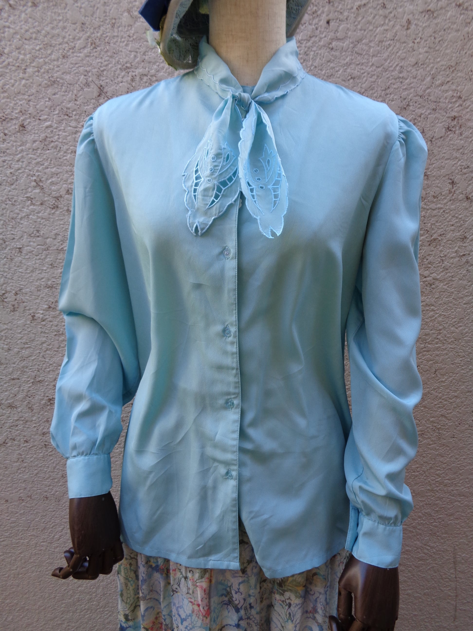 カットワークが施されたボウタイ付きブラウスです。爽やかなライトブルーの色味がコーディネートのポイントになりそうです。
