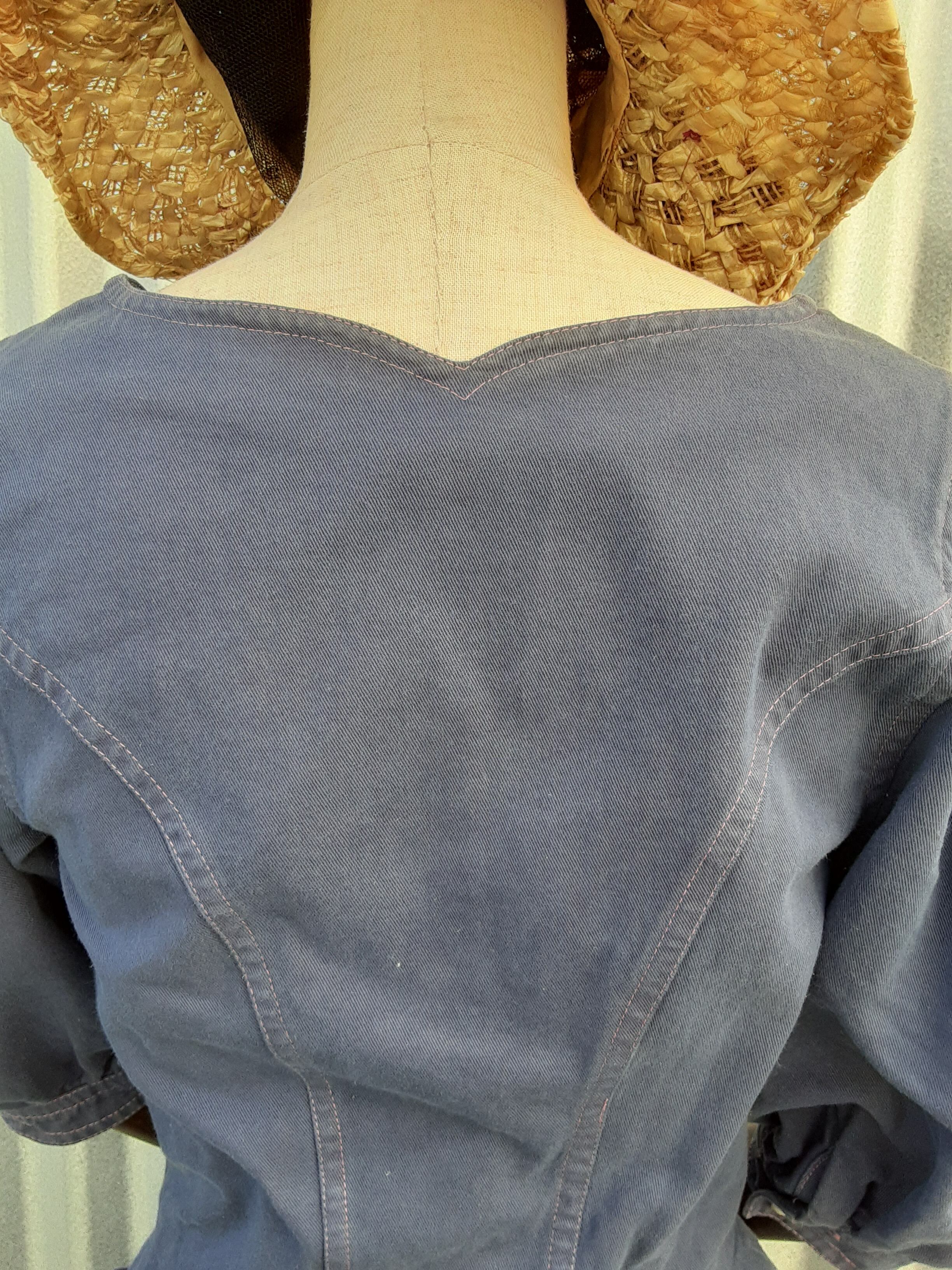 デニム地のような固めな綺麗なネイビーカラーのチロリアンデザインのワンピースです。胸元の花刺、ウエスト、袖部分の細かなステッチが素敵なワンピースです。