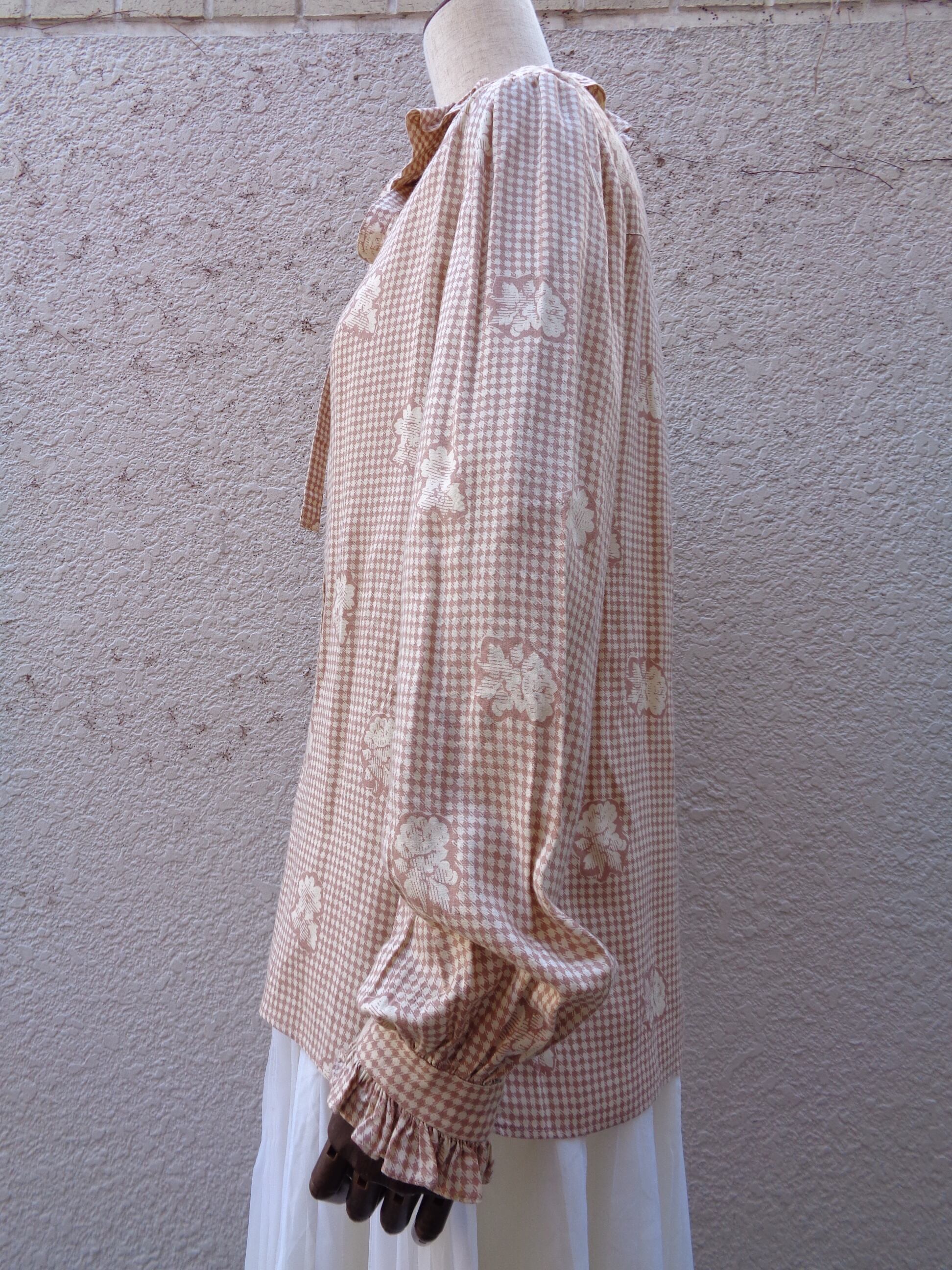 千鳥格子に花がちりばめられた珍しい柄のブラウスです。フリルの襟やボータイが可愛らしい一着です。