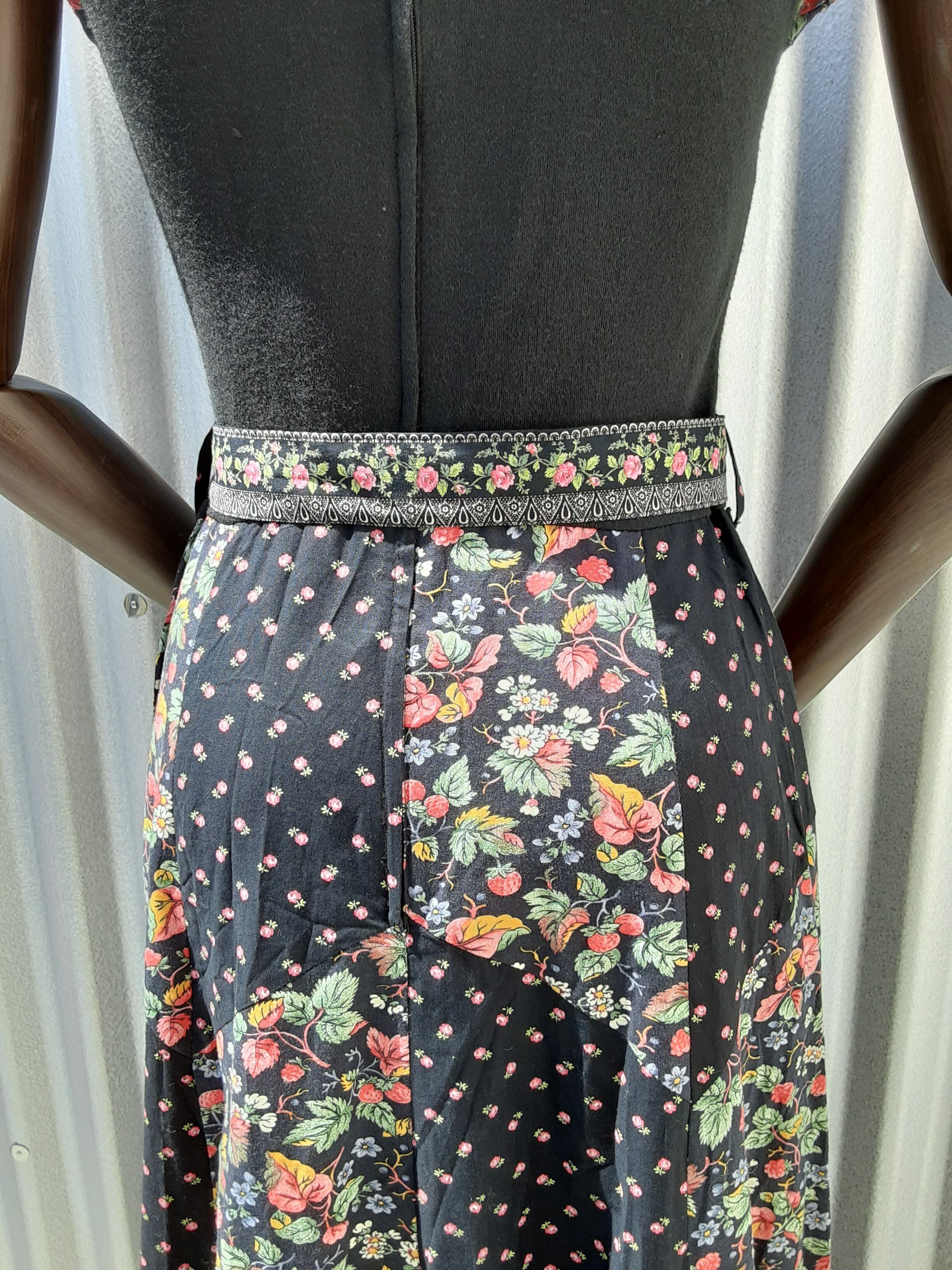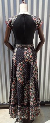 ブラックベースの花柄ノースリーブワンピースです。スカート部分のパッチワークのようなパターンが可愛らしいです。