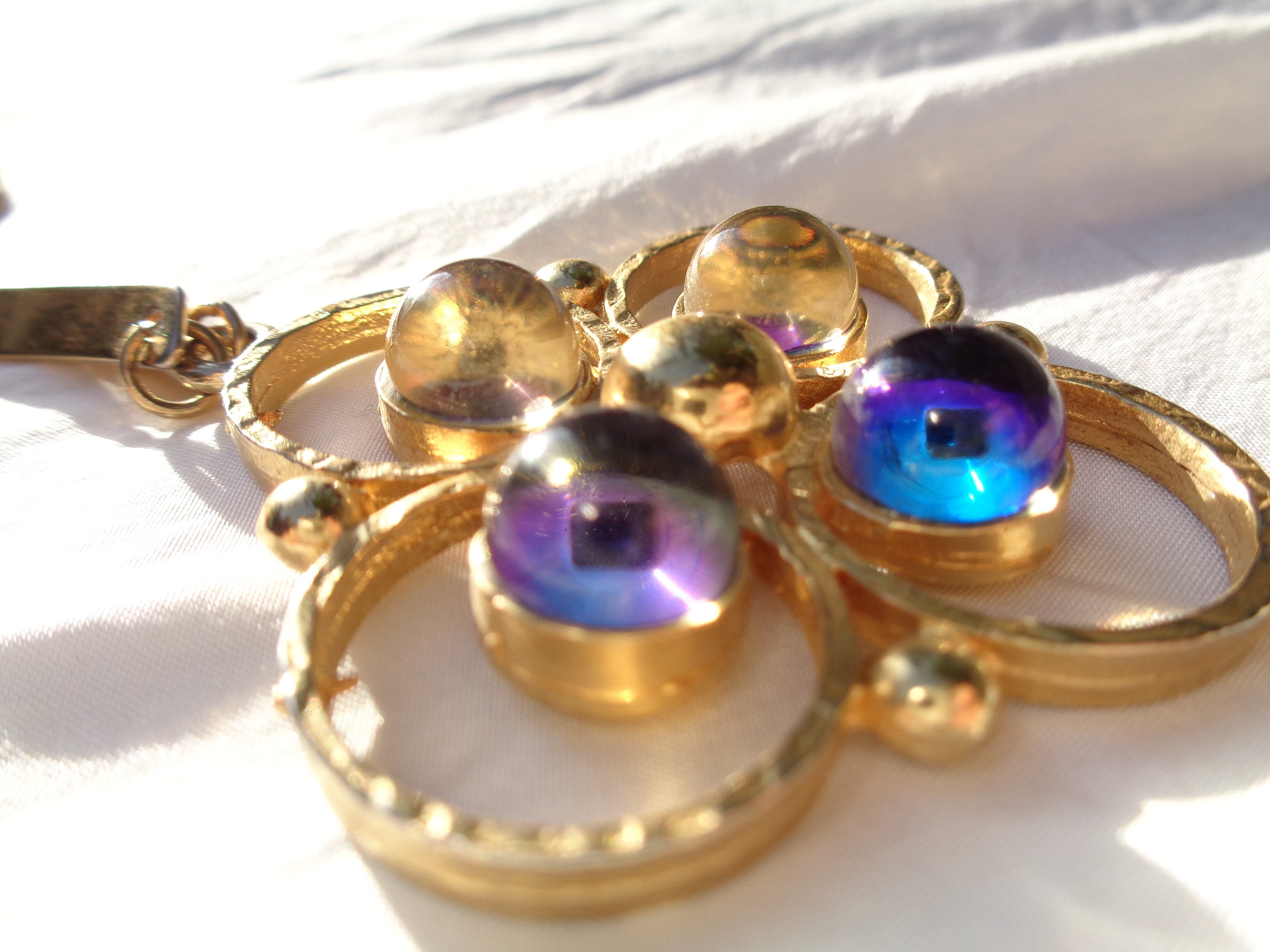 見る角度によって色が変わって見える、ガラスのモチーフがついたネックレスです。