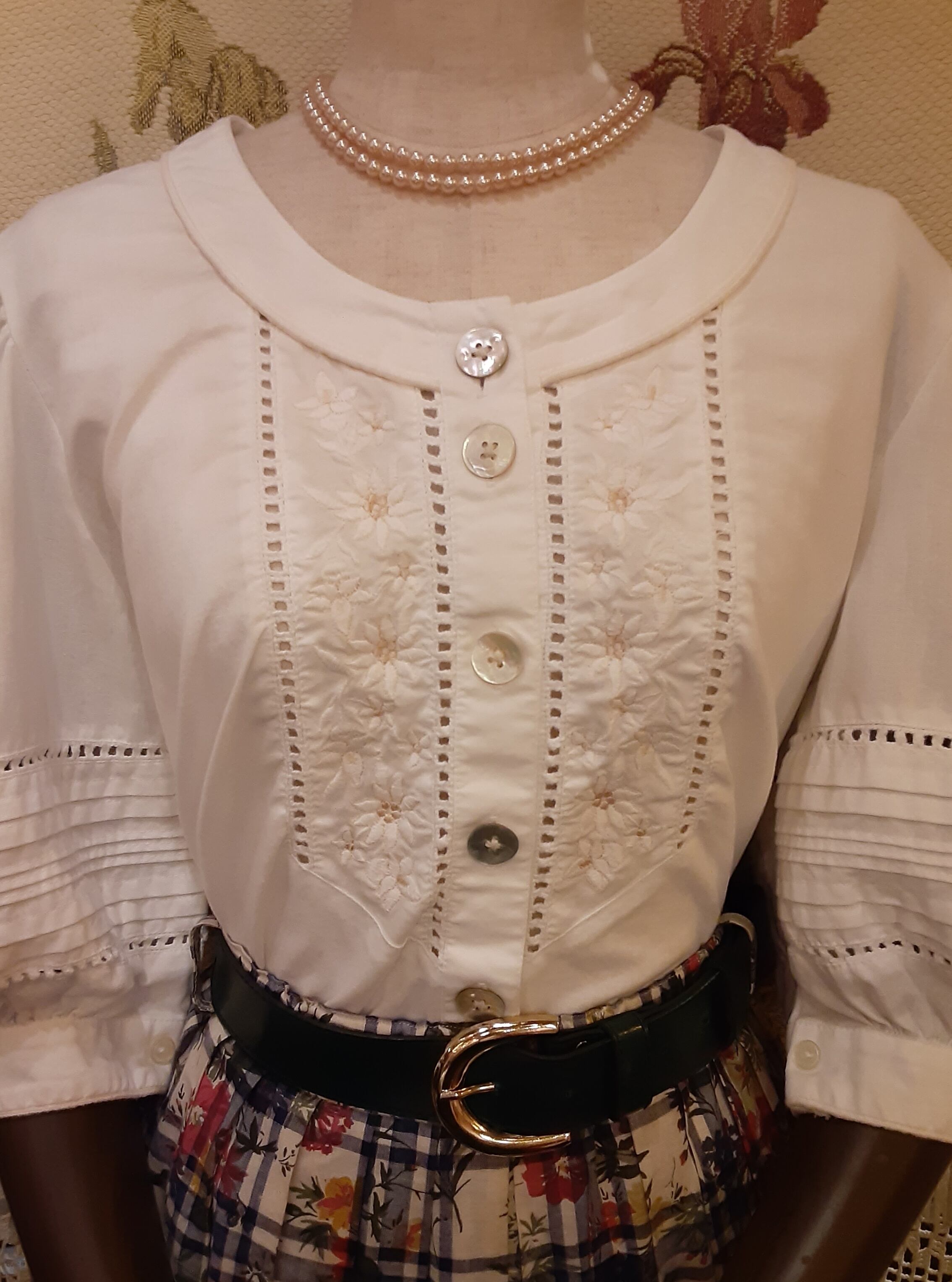 フロント部分にお花の始終があしらわれたホワイトブラウスです。