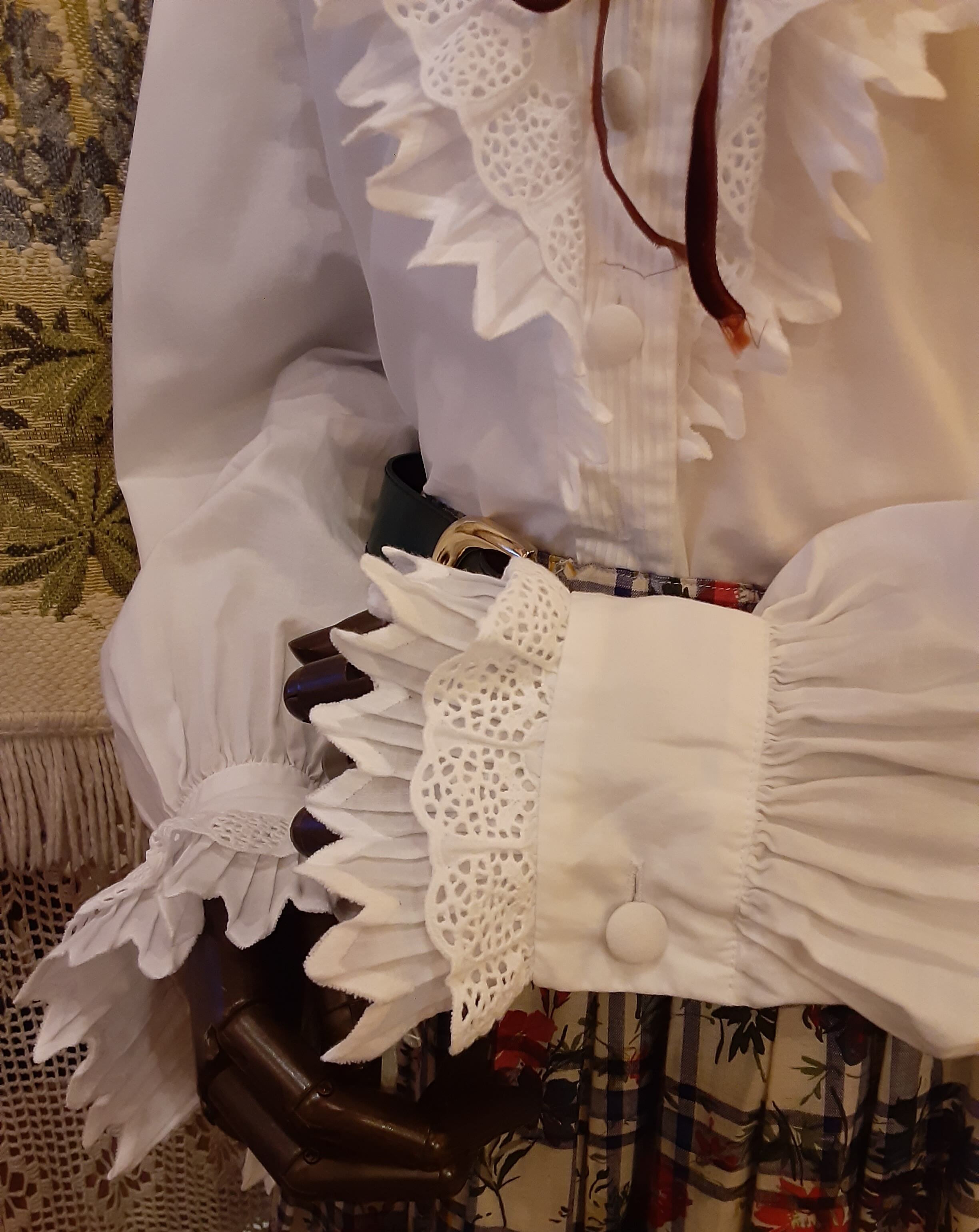 プリーツとカットワークがあしらわれたフリルカラーのホワイトブラウスです。襟をたててもクラシックで素敵です。