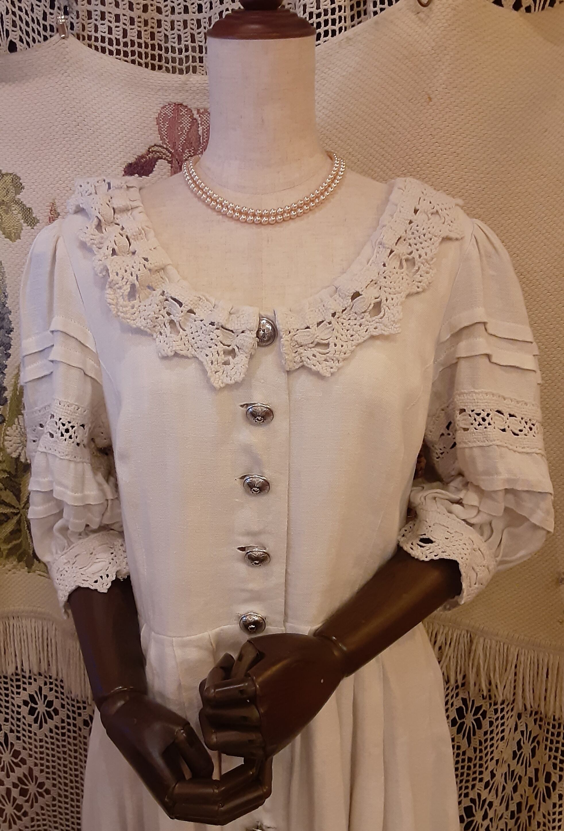 ベージュカラーベースのチロリアンワンピースです。襟と裾部分のクロシェが可愛らしいです。