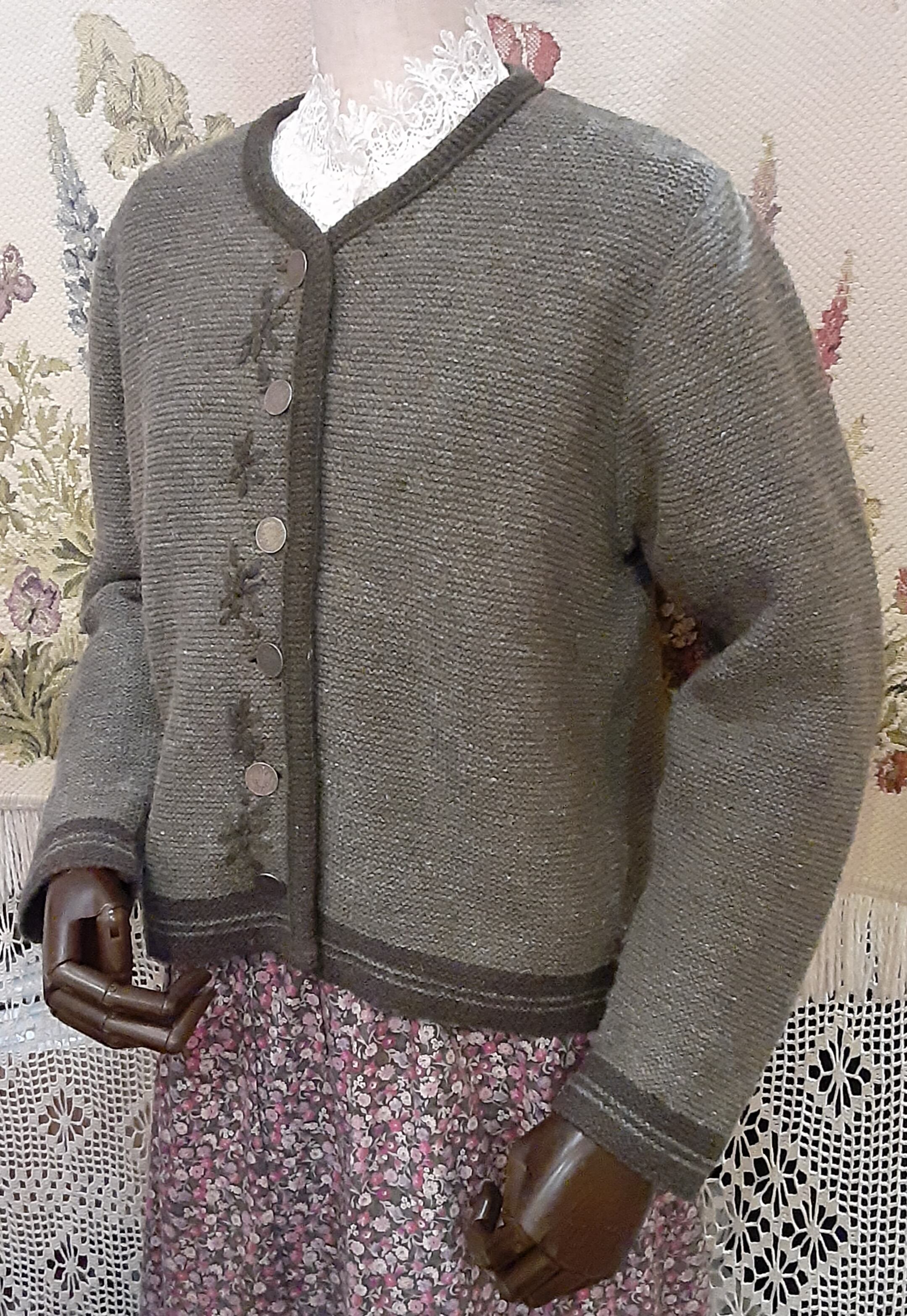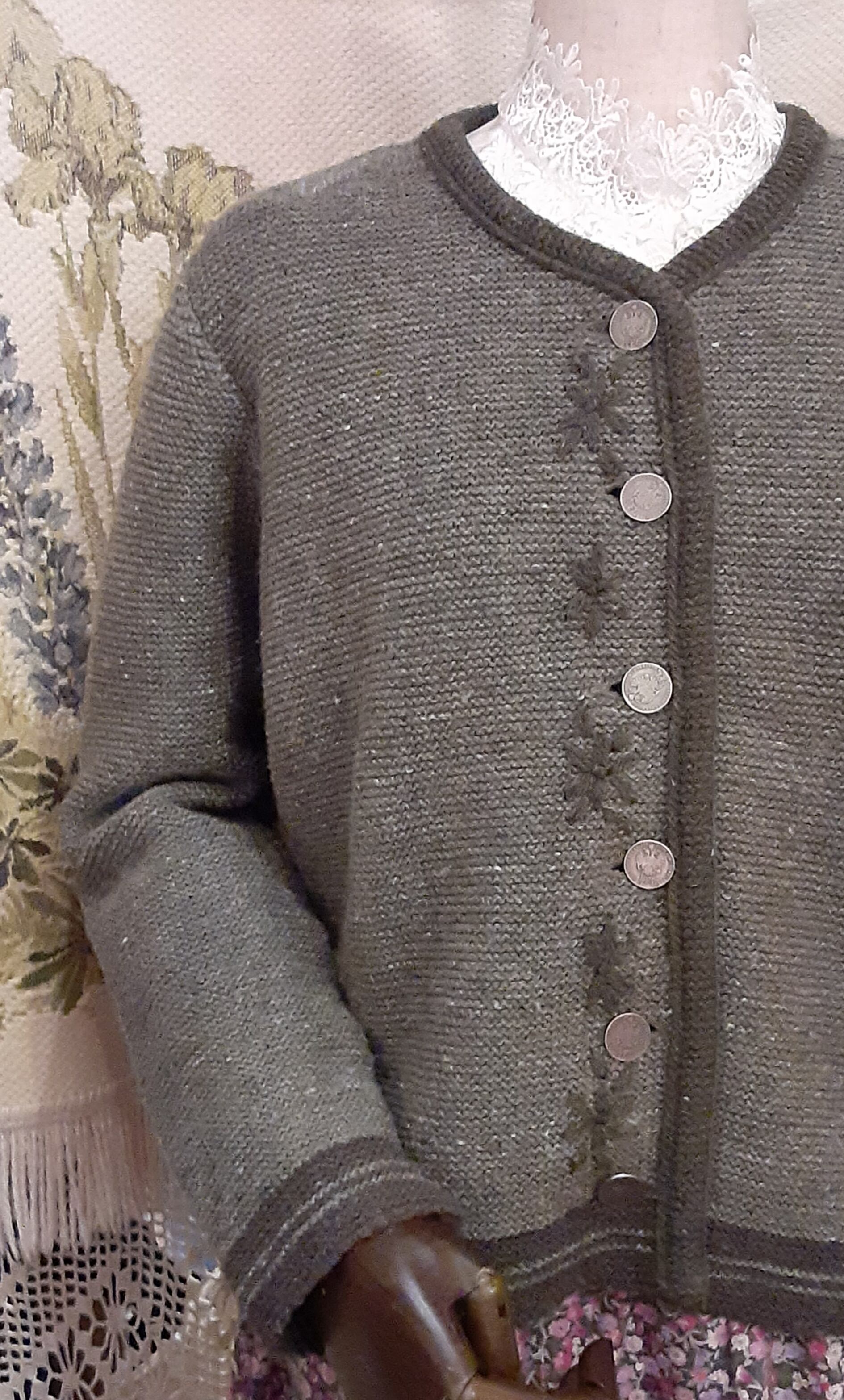 グレーカラーベースのチロリアンカーディガンです。花刺繍、かぎあみ、ボタンが可愛らしいです。